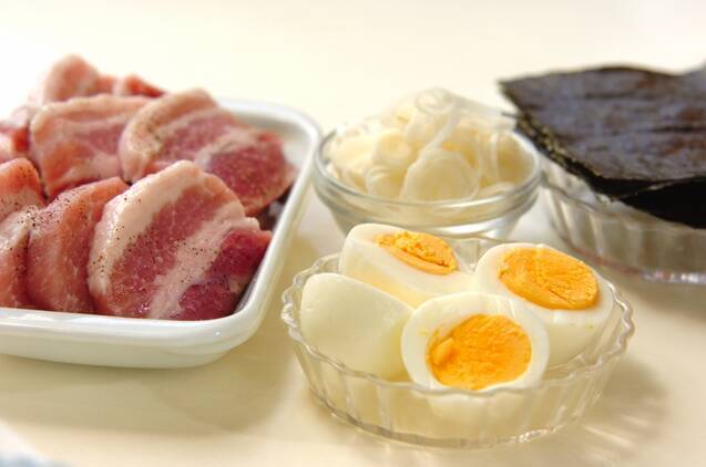 豚バラ肉は厚さ1cmに切り、塩、コショウで下味をつける。ゆで卵は横半分に切る。焼きのりは4等分に切る。白ネギは小口切りにする。