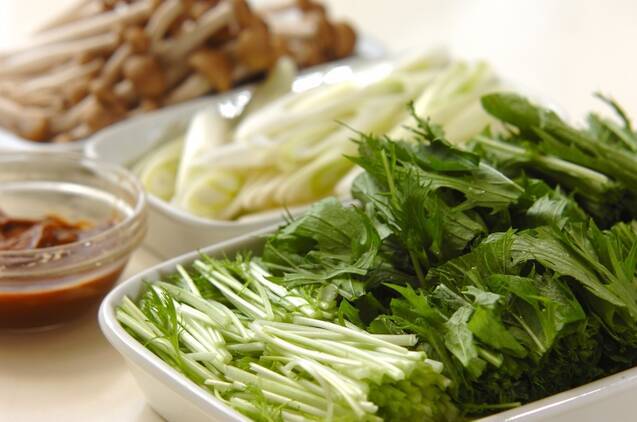 白ネギは斜め薄切りにする。水菜は根元を切り落とし、長さ5cmに切る。シメジは石づきを切り落として食べやすく裂く。<ゴマダレ>の材料を混ぜ合わせる。