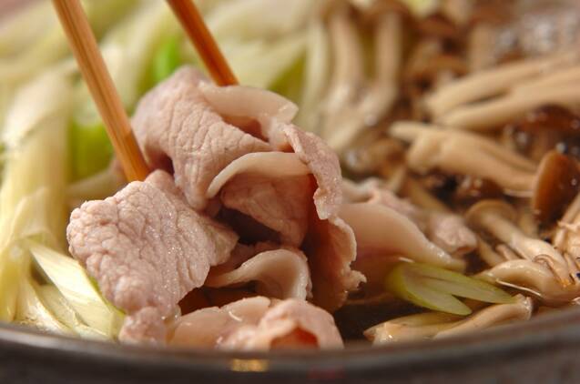 鍋に白ネギ、シメジ、<合わせだし>の材料を入れて強火にかけ、煮たったら弱火にして豚肉、水菜を加える。