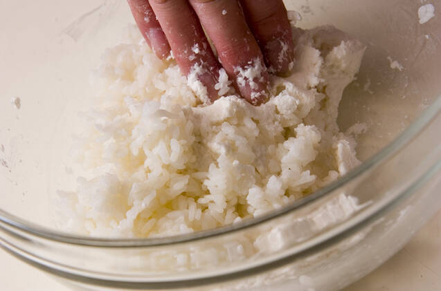 白玉粉に水を少しずつ加えて、耳たぶ位の柔らかさになるまで練る。ご飯を加えて更に練り合わせ、水分が少なければ水を少しずつ加えながら練り合わせる。