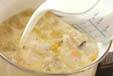 アサリの殻が開けば牛乳を加え、煮立つ直前に火を止め、塩コショウで味を整える。器に入れ、クラッカーを割って加える。