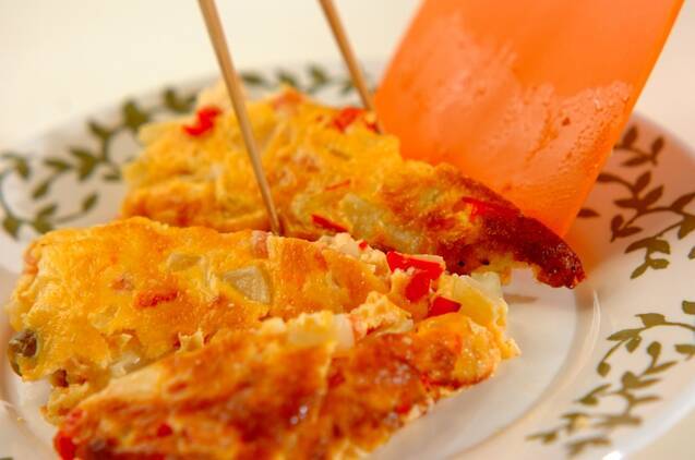 少し冷めたら、容器から取り出して食べやすい大きさに切り分け、器に盛ってケチャップをかける。