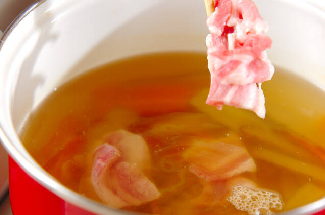 野菜が柔らかくなったら豚肉を加え、火が通ったらみそを溶き入れて火を止め、器に注ぎ分ける。