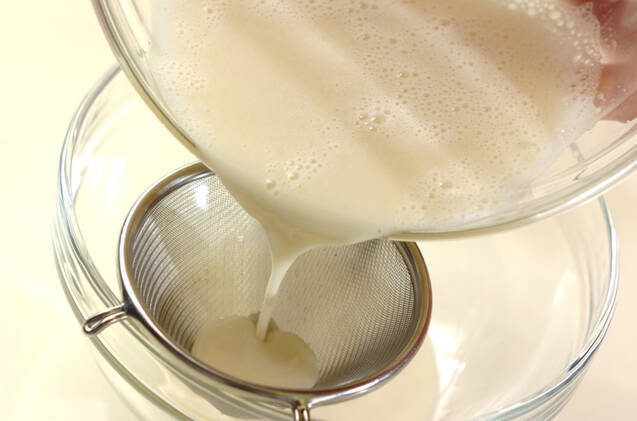 ボウルに白玉粉、葛粉、薄力粉、砂糖を入れて水200mlを少しずつ加えながら泡立て器で混ぜ合わせる。なめらかになったら網を通してダマをなくす。