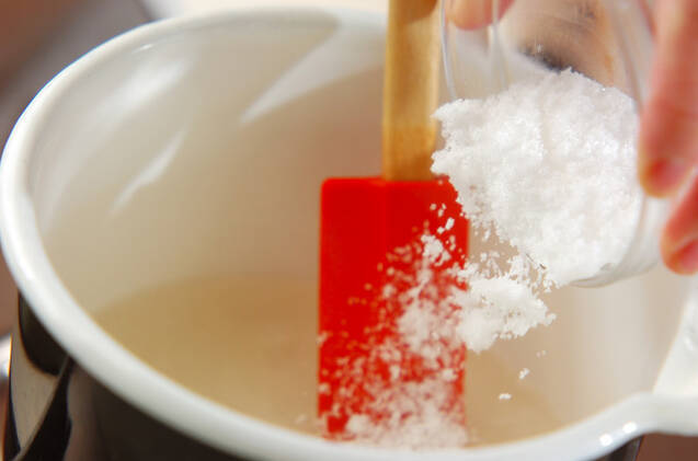 小鍋に水を入れて粉寒天を加え、よく混ぜて溶かし、中火にかけて沸騰状態で1分煮る。砂糖を加えて煮溶かし、沸騰したら火を止める。