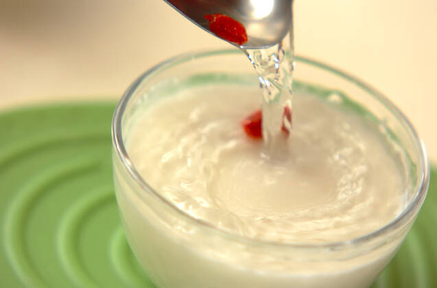 かたまった杏仁豆腐に、クコの実を<シロップ>と一緒に注ぎ入れる。