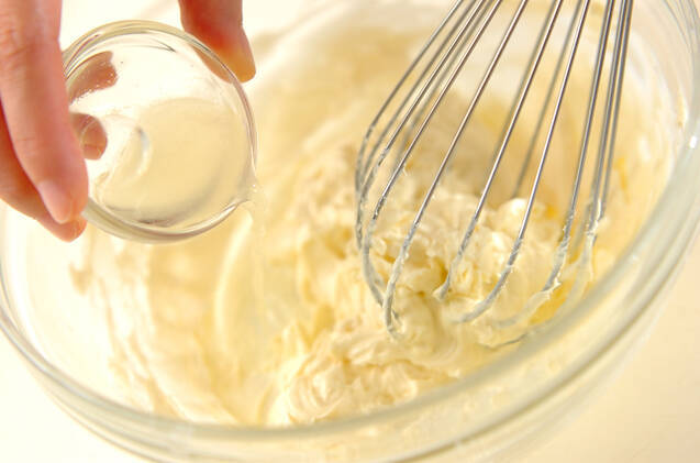 クリームチーズを湯煎にあてて柔らかくし、なめらかになるように混ぜ、プレーンヨーグルト、レモン汁を加えて混ぜ合わせる。