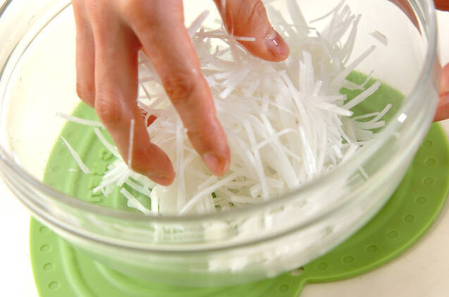 大根は皮をむいて薄い輪切りにし、さらにせん切りにする。分量外の塩を少々入れ、軽くもんで10分置く。水気が出てきたらサッと水洗いし、水気を絞る。