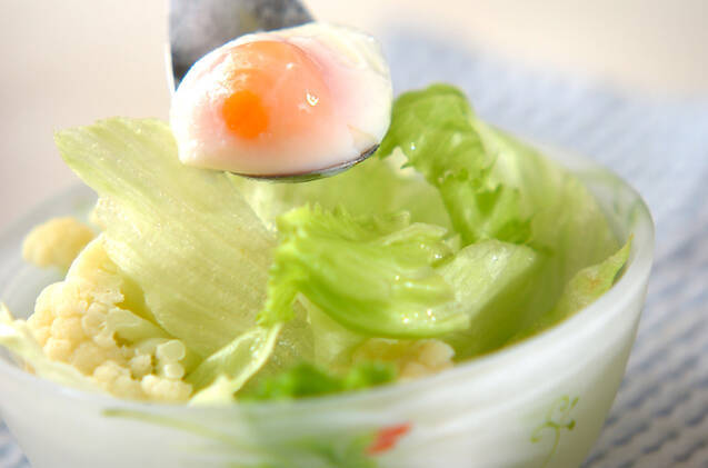 器にレタスとカリフラワーを盛り、(1)の卵をのせてコーンを散らし、<ドレッシング>をかける。