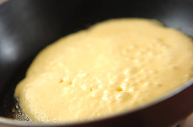 フライパンを弱めの中火にかけてバターを熱し、(1)の生地を適量流し入れ、表面にポツポツ穴があいてきたら裏返し、きれいな焼き色がつくように焼き、皿に盛る。
