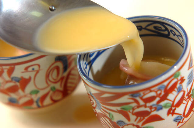 器に鶏もも肉、カマボコを入れ、静かに(1)の<卵液>を注ぎ入れる。