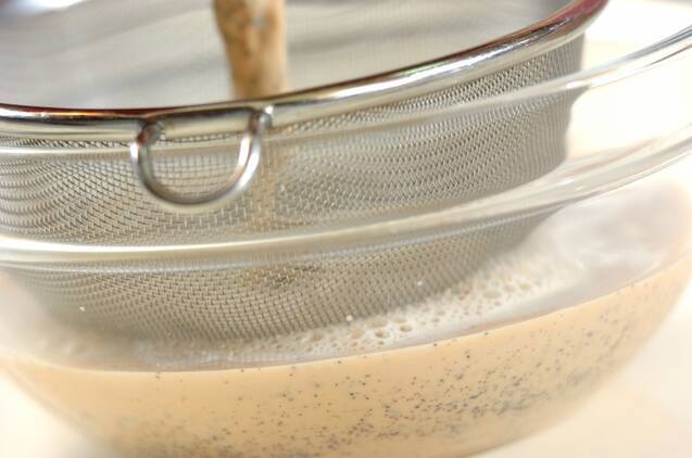 <プリン生地>を作る。小鍋に牛乳、きび砂糖、紅茶を入れ、混ぜながら中火にかける。きび砂糖が溶けたら火を止め、そのまま3分ほど置き、粗熱が取れたらボウルなどに茶こし等でこす。