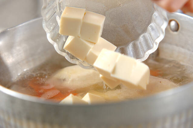 豆腐を加えて白みそを溶き入れ、豆腐が温まったら椀に注ぎ入れる。糸かつお、柔らかめに溶いたからしをのせる。(ヒント)白みその種類によって味が変わりますので、味を確認しながら白みその量を調節して下さい。普段の白みそ汁より少しトロミがついているくらいの量を入れています。