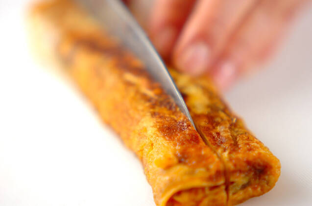 <卵焼き>の材料を混ぜ合わせる。卵焼き器を中火にかけ、薄く分量外のサラダ油をひき、卵液の1/4量を入れて半熟になったら向こう側に寄せる。空いた所にサラダ油をひき、残りの卵液の1/3量を流し入れ、寄せた卵の下にも卵液を流し、手前に巻く。同様に2回繰り返す。巻きすで巻いて形を整え、冷めたら2~4等分に切る。