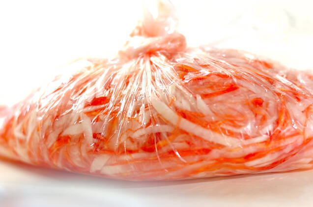 ビニール袋に大根、金時ニンジンと塩を入れ、袋に空気を入れて口をしっかり持ち、上下左右に袋を振って全体に塩をからめる。袋の空気をしっかり抜いて袋の口を縛る。水気が出てきたら、しっかり絞る。