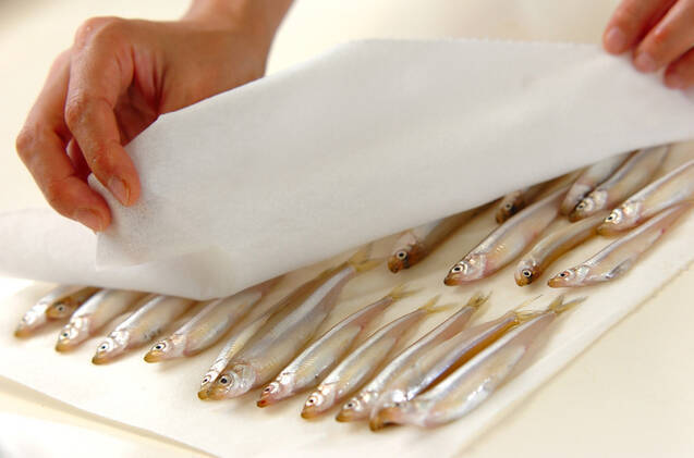 ワカサギはきれいに水洗いして水気をしっかり拭き取り、全体に塩コショウを振る。