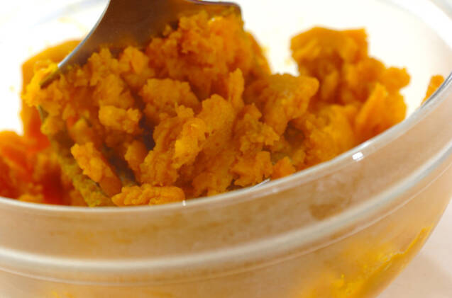 カボチャは種とワタを取り除いて皮を削ぎ落とし、ひとくち大に切る。サッと水に通し、ぬれたまま耐熱容器に並べ、ラップをして電子レンジに7~8分加熱して取り出し、熱いうちにマッシャー等でつぶす。電子レンジは600Wを使用しています。