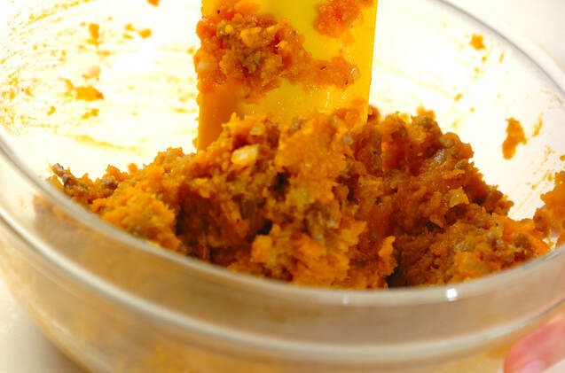 つぶしたカボチャに(1)、<調味料>の材料を加えて混ぜ合わせる。