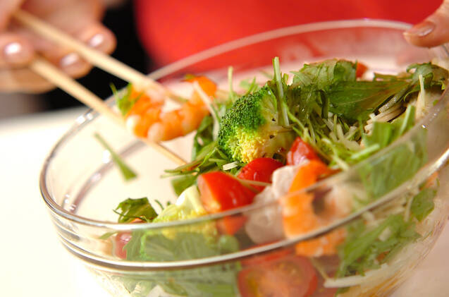 ボウルで<ドレッシング>の材料を混ぜ合わせ、(2)の具を加えて和える。さらに水菜、大根、プチトマトも加えて混ぜ合わせ、器に盛り分ける。