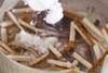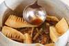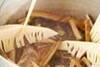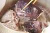 鍋に酒、みりん、水を入れて火にかけ、煮立てば鯛のアラ、ゴボウを加える。