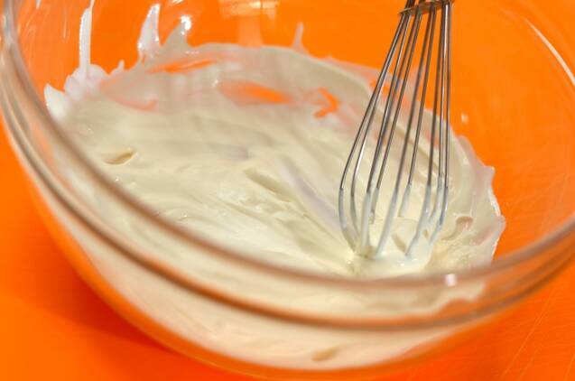 ボウルに生クリーム、レモン汁を入れ、トロミがつくまで混ぜ合わせる。ユズコショウを加えてさらに混ぜ、(2)を加えて和え、器に盛る。