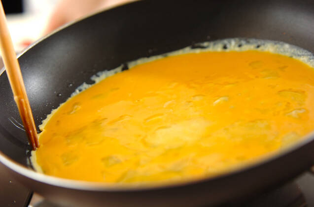 フライパンに分量外のサラダ油を薄くひき、中火にかける。フライパンが温まったら、卵液を一気に流し入れ、全体に薄く広げる。