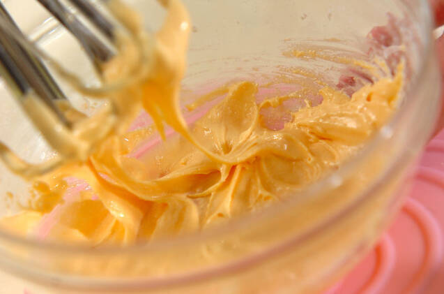 <カスタードクリーム>を作る。ボウルに卵黄と砂糖を入れてハンドミキサーで白っぽくなるまで混ぜる。薄力粉を振るい入れて、粉気がなくなるまで混ぜる。