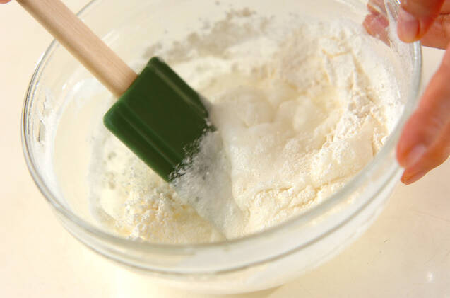 卵白をしっかり角が立つまで泡立て、<衣>の水、小麦粉の順に加えてサックリ混ぜる。