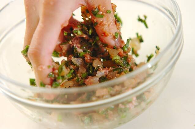 ボウルで(1)、豚ひき肉、<調味料>の材料をよく混ぜ合わせる。