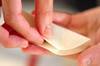 餃子の皮を手にとり、(2)を中央にのせ、皮のフチに水を薄くぬり、餃子の皮をかぶせてしっかり端を押さえる。