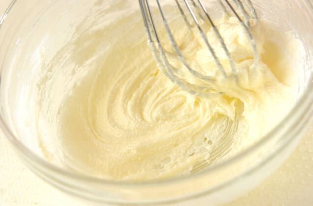 <プレーン生地>を作る。無塩バターをなめらかになるまで泡立て器で混ぜ、グラニュー糖と塩を加えて白っぽくなるまで混ぜる。