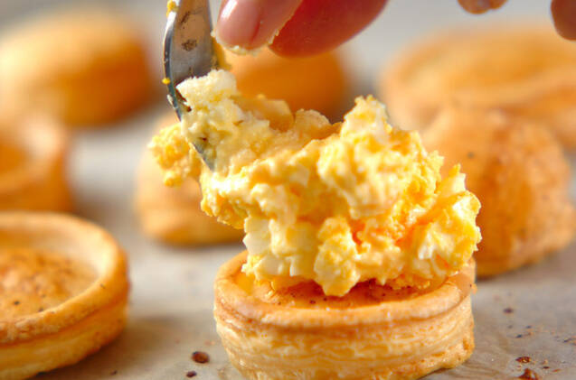 パイシートのくぼみに<エッグサラダ>をのせ、イタリアンパセリを飾る。