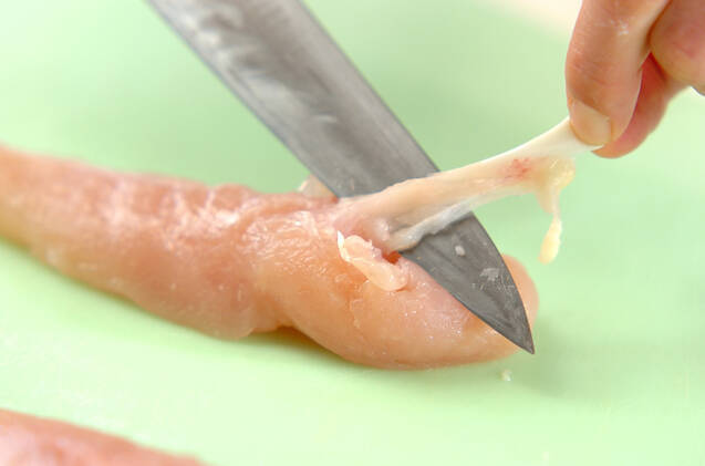 鶏ささ身は筋を引いて耐熱容器に並べ、酒をかける。塩をしてふんわりラップをかけ、電子レンジで1分30秒~2分加熱し、そのままおいて余熱で中まで火を通す。粗熱が取れたら食べやすい大きさに裂く。電子レンジは600Wを使用しています。