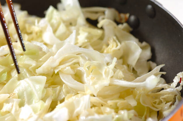 フライパンにオリーブ油、ニンニク、刻み赤唐辛子を入れて中火にかけ、ニンニクの香りが立ってきたらアンチョビとキャベツを加え炒める。