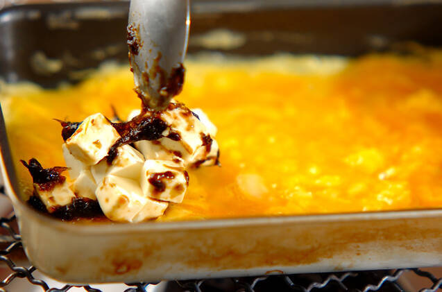卵焼き器にサラダ油を熱し、(1)の<卵液>を流し入れる。菜ばしで手早く混ぜ、半熟になったら<のりチーズ>を奧側の横一列にのせ、手前に向かって巻く。