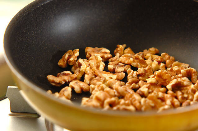クルミはフライパンを中火にかけ、焦がさないように乾煎りする。