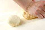 ニンジンの半量は薄切りにし、残り半量はすりおろしてニンジン汁にする。ボウルに<餃子の皮>の材料を2つに分けて入れ、片方にはニンジン汁と水を、片方は水を加え、それぞれ粉っぽさがなくなるまで混ぜ合わせる。手でボウルの粉を取りながら力を入れてこねる。生地が1つにまとまり、もっちりしたら丸めてボウルに入れる。固く絞ったぬれ布巾をかけ、寝かせる。
