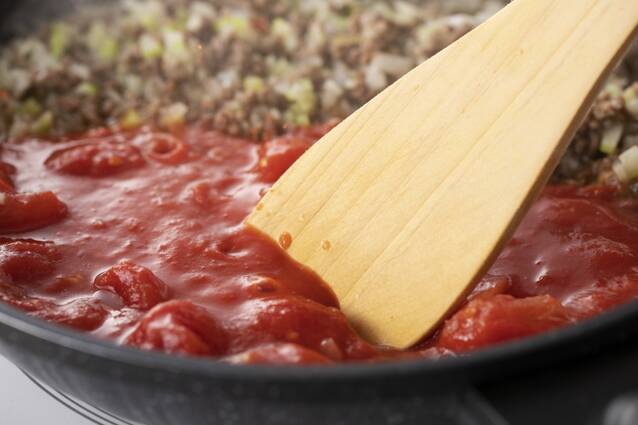 ヘラでトマトを潰しながら水気が飛ぶまで炒め、塩コショウで味を調える。
