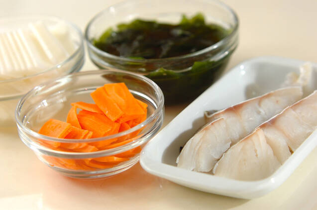 タラはサッと水洗いして水気を拭き取り、1切れを2~3等分に切る。大根、ニンジンは皮をむき、縦に2~3等分し、さらに薄い短冊切りにする。ワカメは水で柔らかくもどし、水気を絞る。