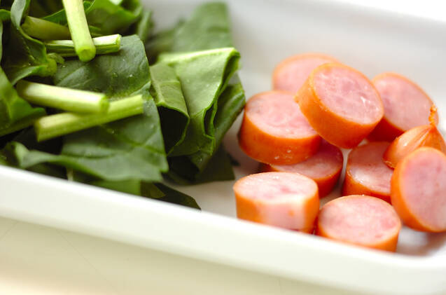 <水煮豆のスープ>の水煮大豆はザルに上げ、サッと水洗いして水気をきる。ホウレン草は水洗いして根元を少し切り落とし、幅2cmに切る。ソーセージは幅1cmに切る。