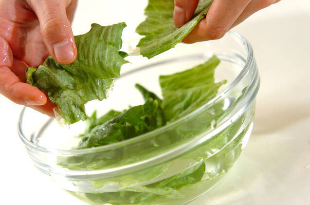 レタスは食べやすい大きさに手でちぎって冷水に放ち、パリッとしたらしっかり水気をきる。プチトマトは水洗いし、縦半分に切る。大葉は水洗いして水気をきり、軸の部分を切り落とす。