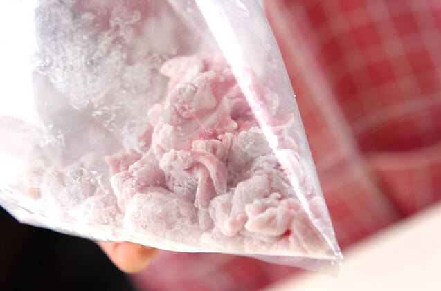 豚肉は長さ4~5cmに切って酒をからめ、5分以上置いて片栗粉をからめる。