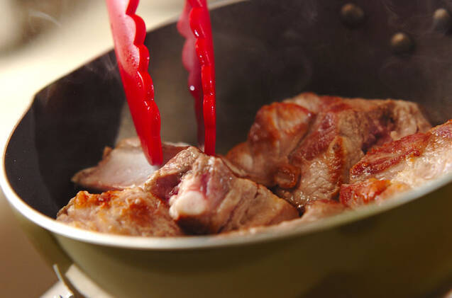 深めのフライパンを熱し、油などはひかずに骨付き豚バラ肉を並べて焼き色がつくまで焼く。
