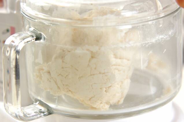 オリーブ油、ぬるま湯を少しずつ加えてかくはんし、まとまってきたら3分位こねて(生地を伸ばしてもちぎれない位)ボウルに取り出し、ラップをして温かい場所で約30分おく。