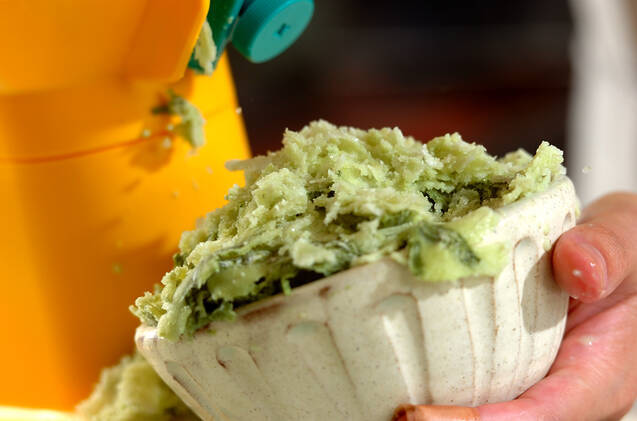 (1)の抹茶ミルク氷を器に削りながら入れる。