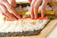 山クラゲ、卵焼き、カニ風味カマボコをへこみに並べ、具を押さえるようにして、巻きすごと転がすように巻き込む。巻きすごと軽く押さえて形を整え、お好みの大きさに切り、器に盛って甘酢ショウガを添える。海苔を半分に切り、山クラゲだけを細巻きにしても美味しいです。