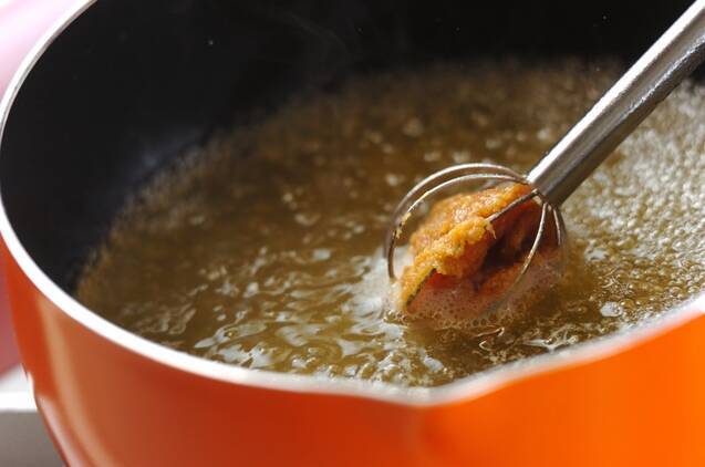 鍋にだし汁を入れて強火にかけ、煮たったらみそを溶き入れる。