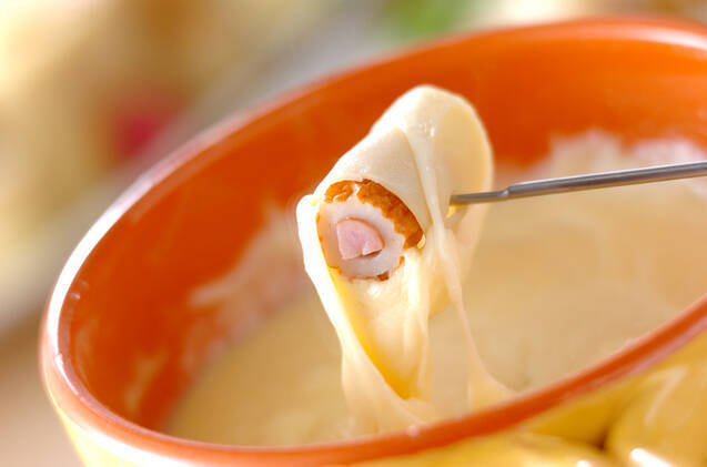 器にサラダ菜を敷いて4を盛り、ラディッシュとウズラの卵を添える。フォンデュ用の長いフォークに4のカネロニを突き刺し、チーズにからめていただく。