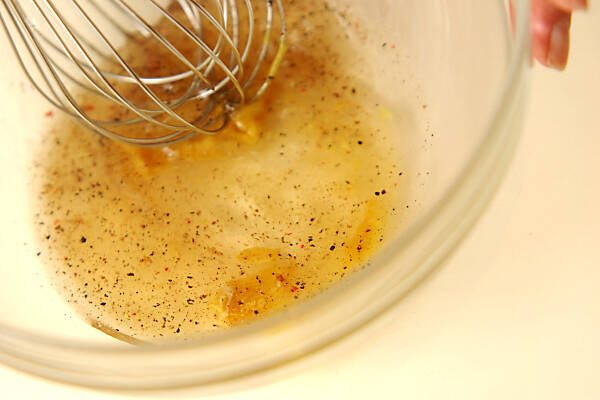 ボウルにサラダ油以外の材料を加え泡立て器でよくすり混ぜ、塩を溶かす。