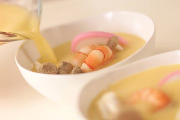 器に3の鶏もも肉、エビ、薄切りにしたカマボコ、シメジ、銀杏を入れ、卵液を静かに注ぐ。具は他にも季節感のある物を入れてもいですね。(ゆりね、干しシイタケ、さっとゆでた銀杏など)
